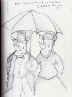 What a lovely rhino couple out for a stroll in the rain....my kind of rhinos! Dapper Dan Rhino.